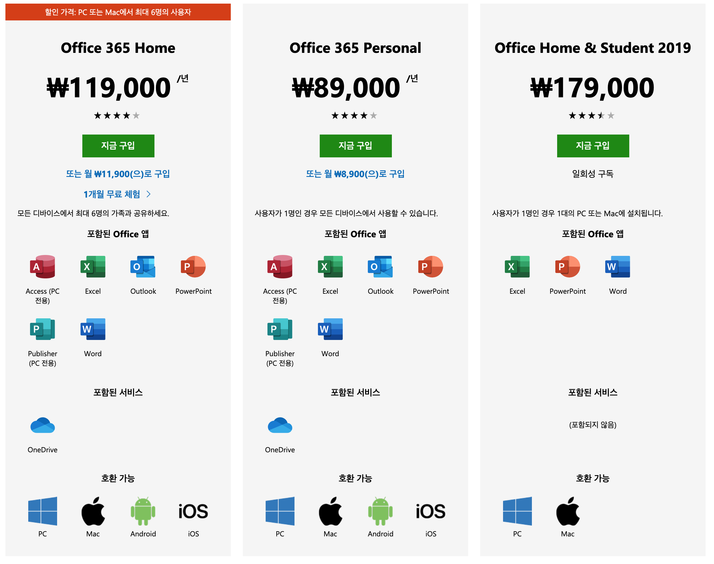 마이크로소프트에서는 오피스를 이제 연간 구독 방식으로 판매하고 있습니다