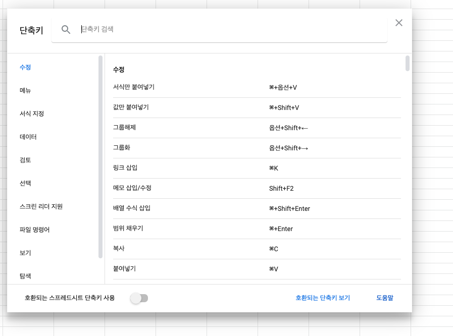단축키는 도움말 하단을 통해서 모두 확인할 수 있습니다