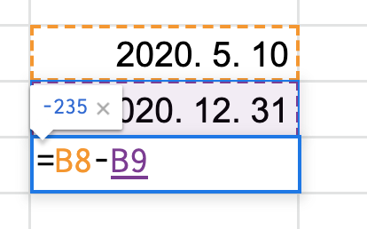 엑셀 스프레드 시트에서 계산은 스마트해서 이게 날짜라는걸 인식하고 그 날짜 사이의 '일'을 단지 빼기 만으로 계산해줍니다