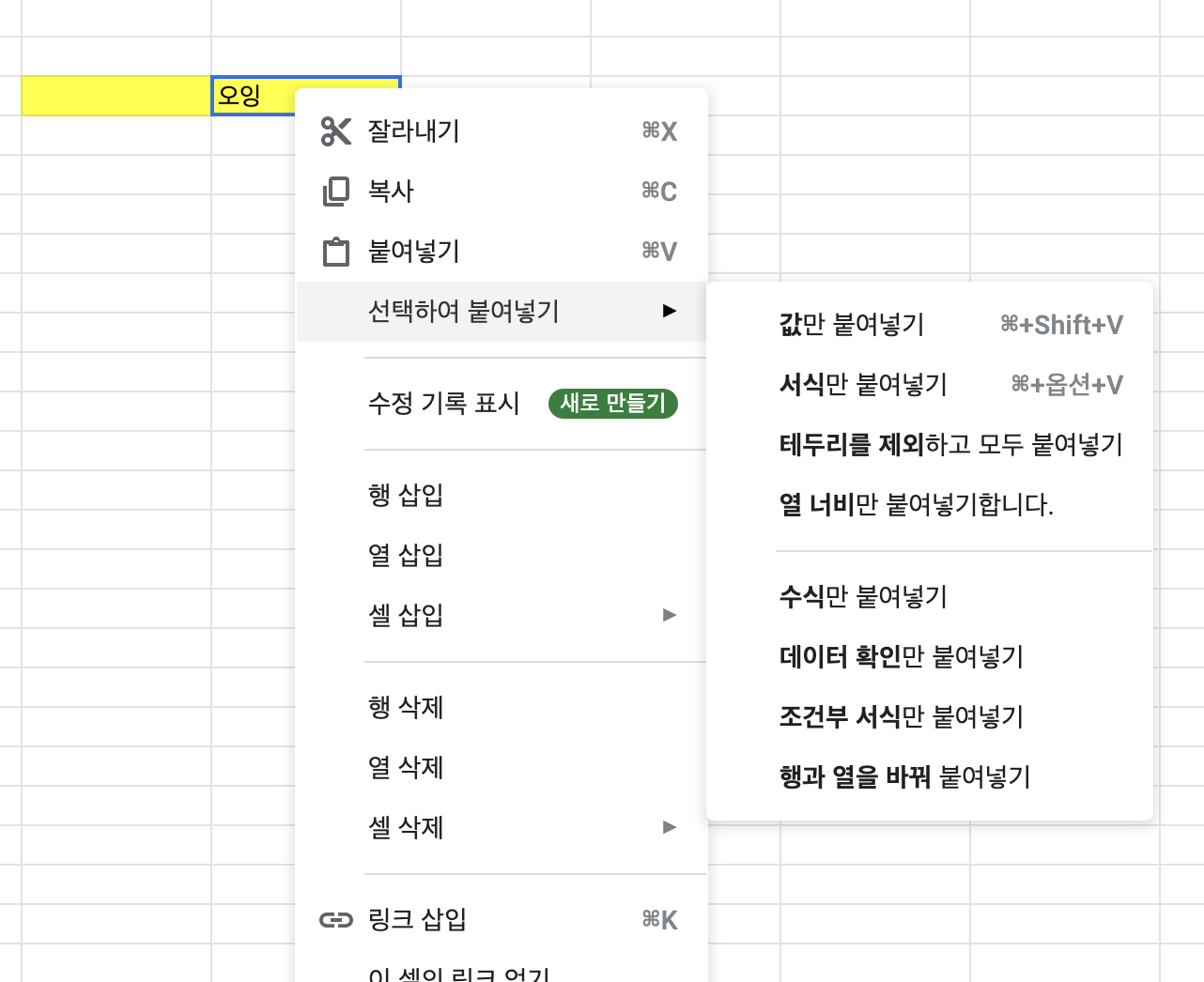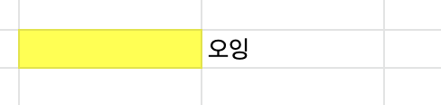 이렇게 좌측 열에 이미 서식으로 컬러가 칠해져 있고 오잉이라고 적혀있는 셀에 서식을 가져오고 싶을 때 가져오고 싶은 서식을 복사하고 cmd + c 붙여 넣고 싶은 셀에 cmd +v를 해줍니다. 그러면 아주 쉽게 빠르게 서식들을 붙여 넣을 수 있습니다.