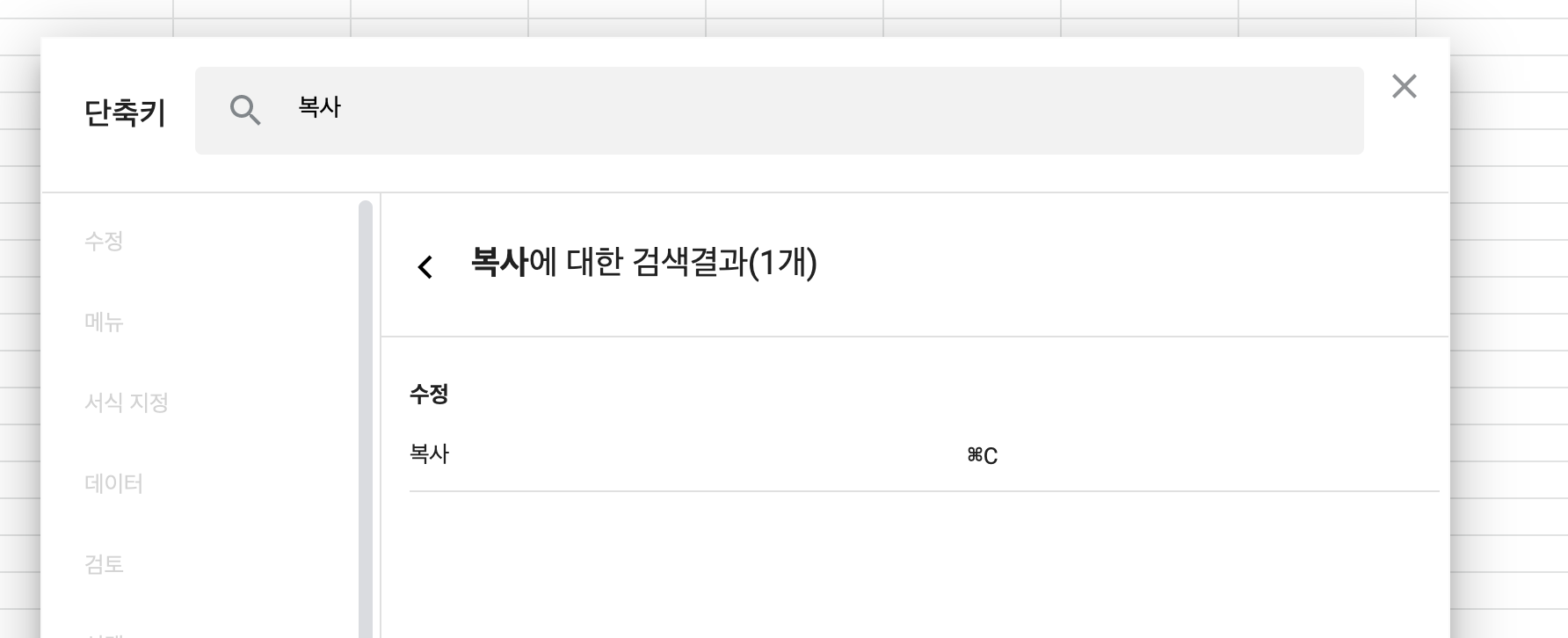 단축키 팝업이 열렸습니다. 궁금한 단축키를 간단히 생각나는 대로 상단에 검색해서 찾을 수 있습니다. 복사가 궁금하다면 위에 복사를 넣으면