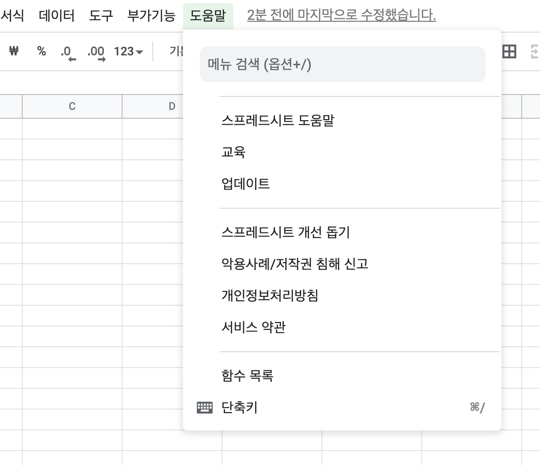 스프레드시트에서는 상단 메뉴에서 도움말을 클릭하면 단축키를 찾을 수 있습니다. 저는 맥을 쓰는데요 맥의 경우 단축기 cmd + / 을 치시면 바로 단축키가 있는 항목이 열리게 됩니다.