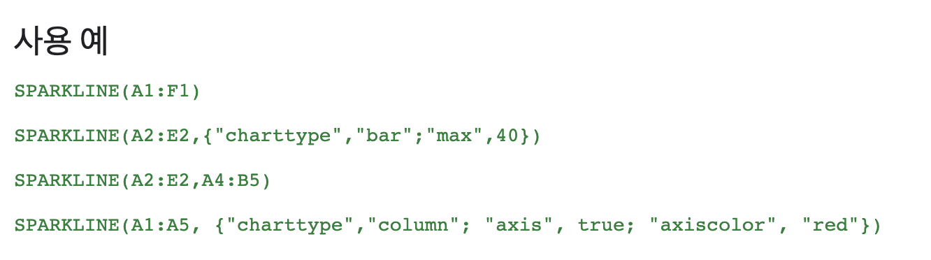 스파크라인은 단일 셀 내에 포함된 소형 차트를 만드는 방법으로 구글 스프레드시트에서 지원하는 함수입니다