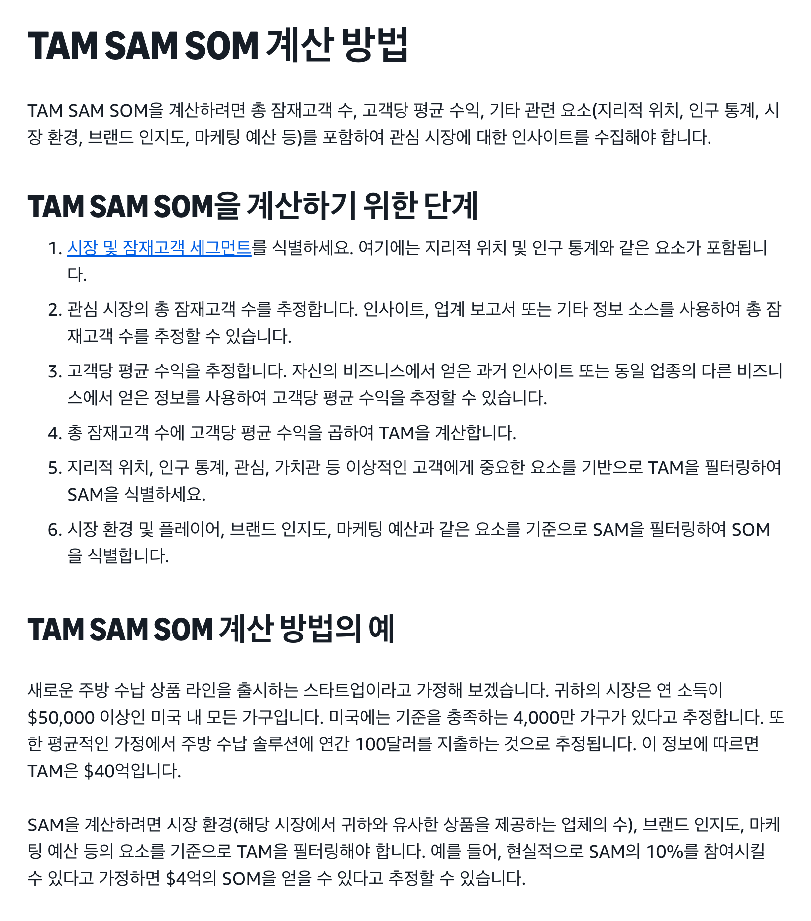 위 순서에서 느끼셨겠지만 논리적인 연결성은 더 큰 시장에서 점점 좁히면서 SOM까지 줄여나가는데요. 왜 시장을 그렇게 정의했고 숫자는 맞는지를 잘 설명하는 논리가 뒷받침되어야합니다.